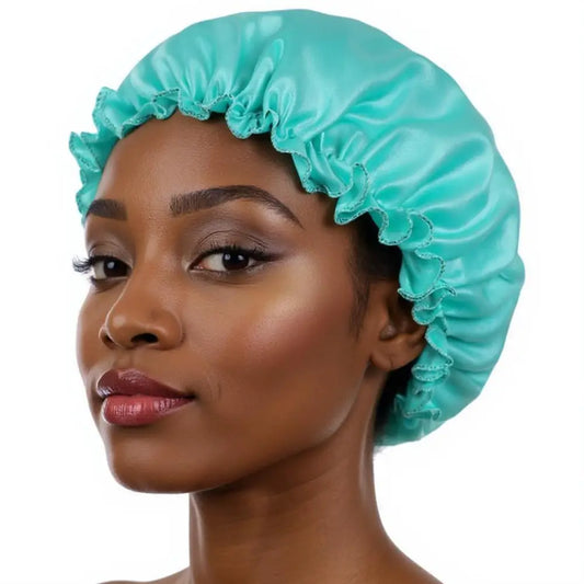 - Cheveux longs ou très volumineux ? Opte pour un bonnet en soie avec un ruban ajustable ou une forme haute.