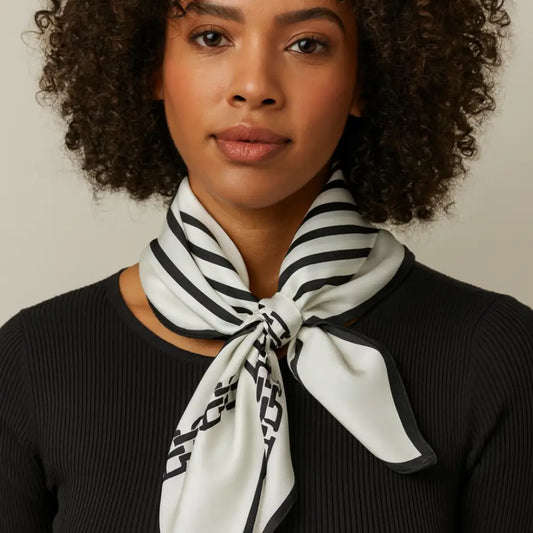 Pas de panique ! Le foulard cheveux court est ton nouvel indispensable. Choisis un modèle carré (50x50 cm ou 70x70 cm) et opte pour un nouage en bandeau ou turban mini. Tu peux aussi le glisser sur la nuque avec un nœud discret : effet rétro chic garanti.